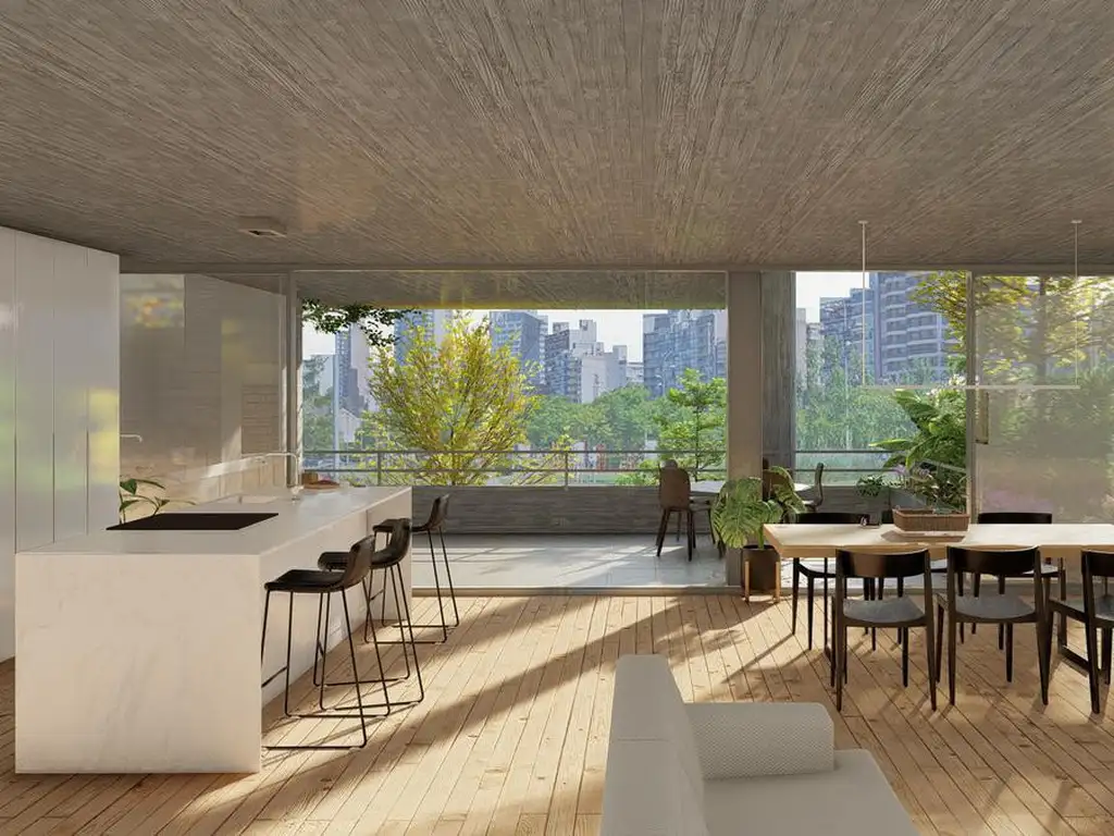 Pisos exclusivos con 3 dormitorios, ingreso a gran living-comedor con cocina anexa, balcones aterrazados al frente con parrilleros propios, lavadero o espacio de comodín diferenciado, toilette de recepción y sector íntimo al contrafrente con dormitorios y 2 baños más (uno de ellos en suite con vestidor) más acceso a balcón técnico. Terminación de categoría con lineamientos arquitectónicos y detalles en hormigón visto, aberturas de aluminio con vidrios DVH con control solar, pisos de madera de ingeniería en combinación con porcelanato en espacios húmedos, aire acondicionado central con sistema tipo VRV, placares completos con interiores, cocina con gran isla de cuarzo blanco, amoblamientos laqueado en blanco de piso a techo, bacha de acero inoxidable con grifería mono comando, preinstalación para lavavajillas, anafe vitrocerámico y horno eléctrico, espacio técnico para heladera. Agua caliente central del edificio mediante calderas eléctricos y termotanque eléctrico instalado en cada departamento. Baños completos, bañera en baño suite, sanitarios de primera línea y griferías mono comando, espejos de punta a punta.