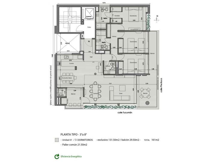 Cuenta con espacio de guardado en el paso a dormitorios, persianas eléctricas, horno eléctrico, anafe a gas, caldera con preinstalación para radiadores, espacio para lavarropas y parrillero propio.