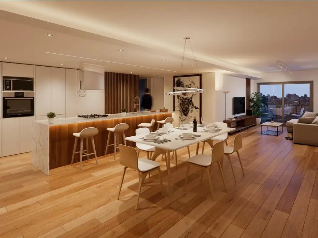 Ingreso a amplísimo living-comedor con sector de cocina completo con alacena y doble bajo mesada tipo isla.