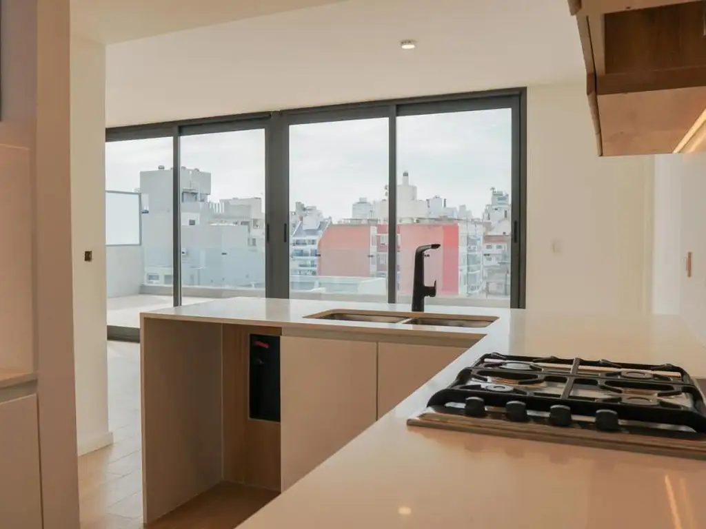 Departamento exclusivo ubicado en piso 10, muy luminoso de diseño exclusivo, compuesto por cocina integrada con horno y anafe a gas, mesada y alzada de purastone, muebles de bajo mesada con frente laqueado y alacena con acabado Nebraska natural y pileta de acero inoxidable marca Johnson, living-comedor, lavadero independiente, 3 baños completos, 3 dormitorios con interiores de placard instalados -2 de ellos con vestidor y baño en suite- y balcón aterrazado con parrillero al frente.