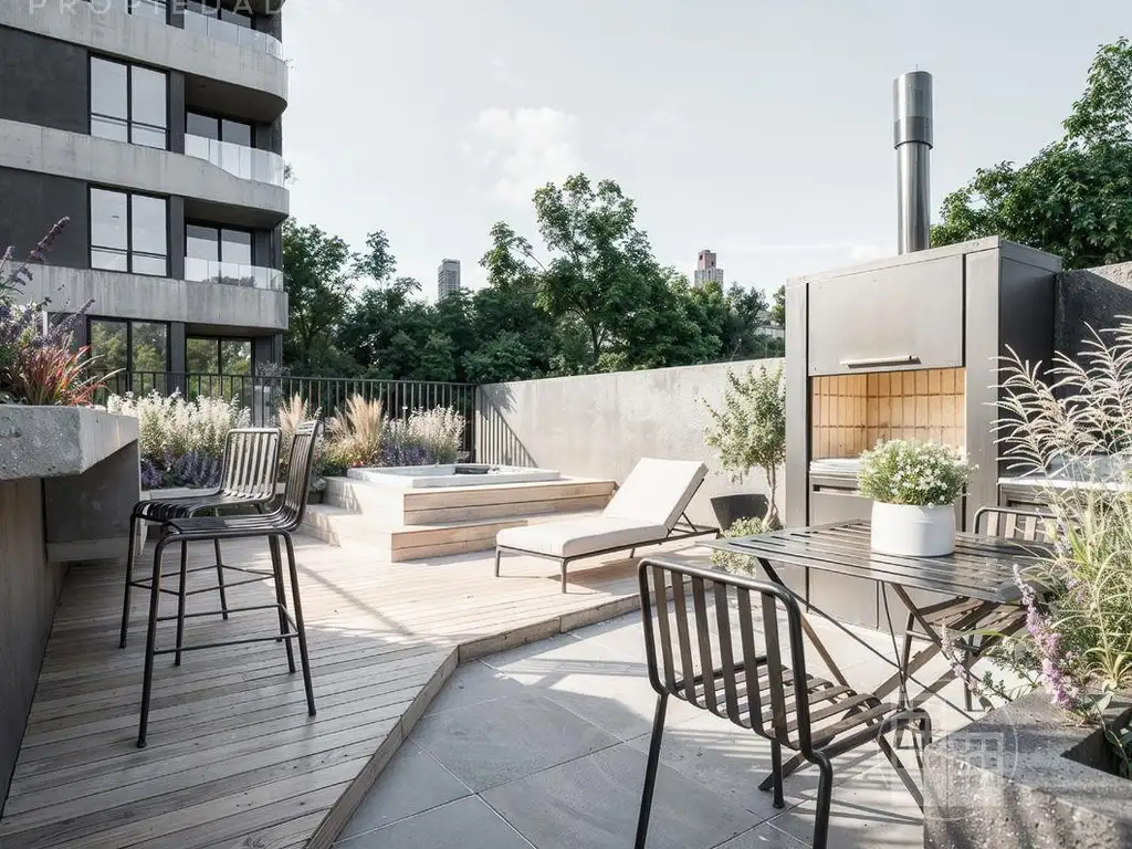 Al ingresar, un hall jerarquizado conecta de manera armónica el interior con el exterior, incorporando vegetación que aporta calidez y serenidad. La impronta verde se extiende a lo largo del edificio con balcones, patios y terrazas que suman más de 595 m2 destinados a áreas privadas al aire libre. Estos espacios se convierten en verdaderos oasis urbanos, ideales para relajarse, trabajar en un entorno natural o simplemente contemplar las vistas panorámicas de la ciudad.