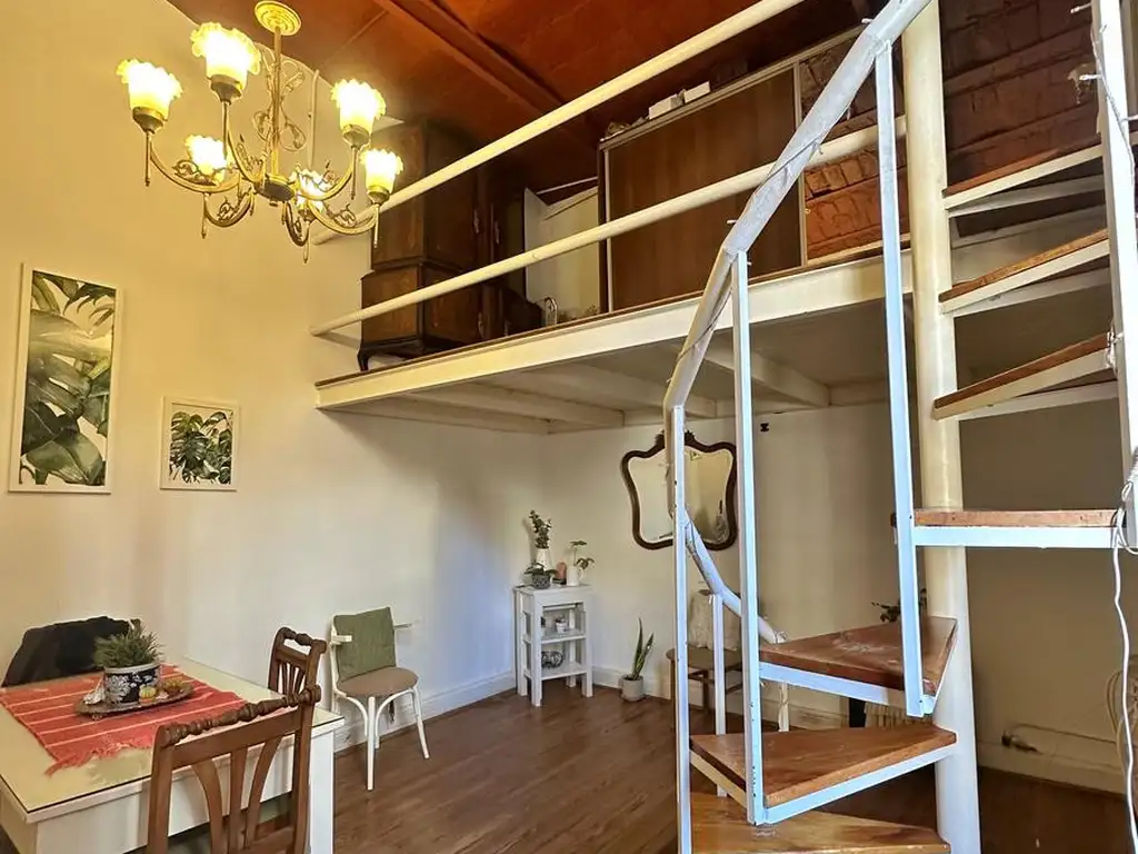 El living comedor es amplio y luminoso, con acceso al dormitorio principal, que cuenta con ventilación al balcón y un mini vestidor. Desde el living se accede a un entrepiso, actualmente utilizado como escritorio o espacio de guardado, que conecta con el segundo dormitorio y con la terraza de uso exclusivo, ideal para disfrutar al aire libre.