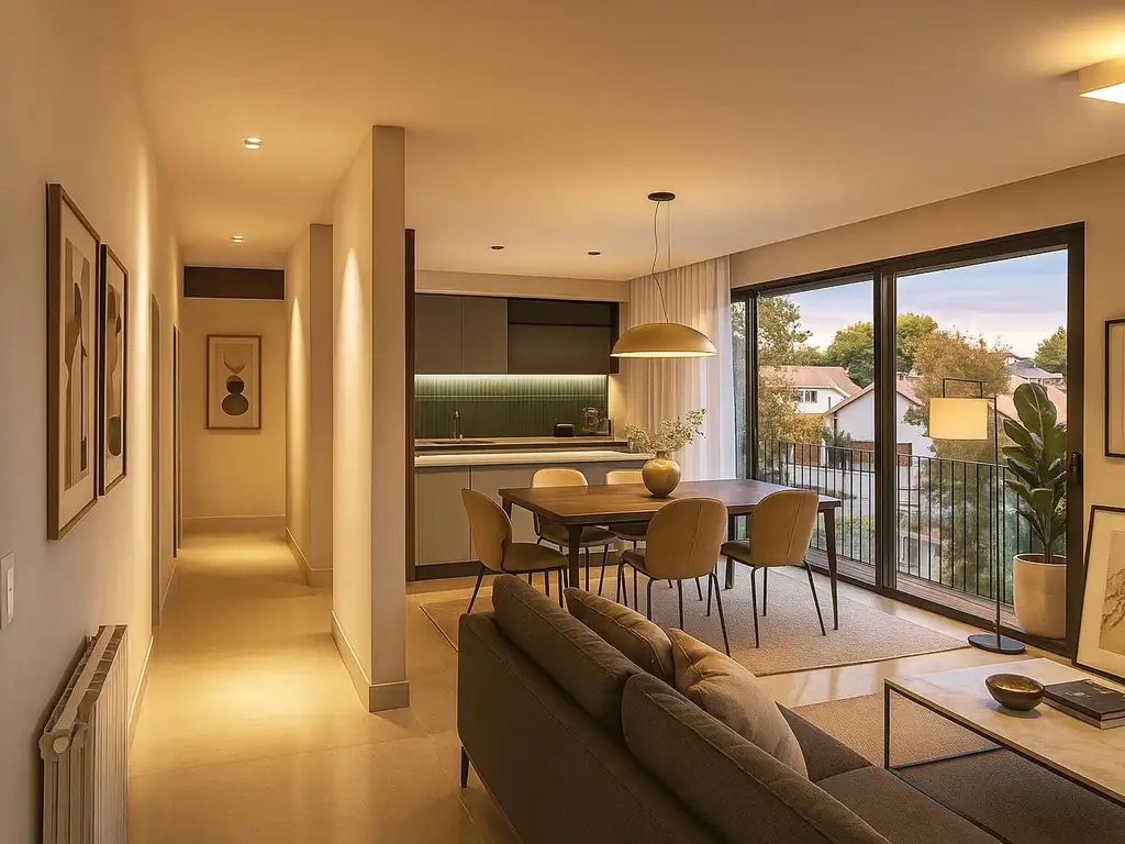 o Amplio y luminoso living comedor de 7 metros de largo, conectado a dos majestuosos balcones con vistas sobre la fachada.