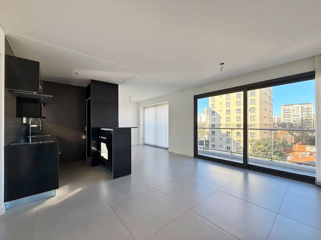 Amplio ambiente al contrafrente con balcón corrido con vista abierte, cocina integrada con barra y espacio para lavarropas, placard y baño completo con box de ducha.