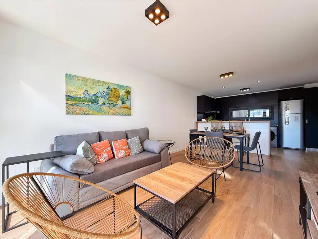 Amplio living comedor con balcón corrido a la calle, cocina integrada con isla y espacio para lavarropas, dormitorio al frente con salida al balcón y un baño completo con box de ducha.