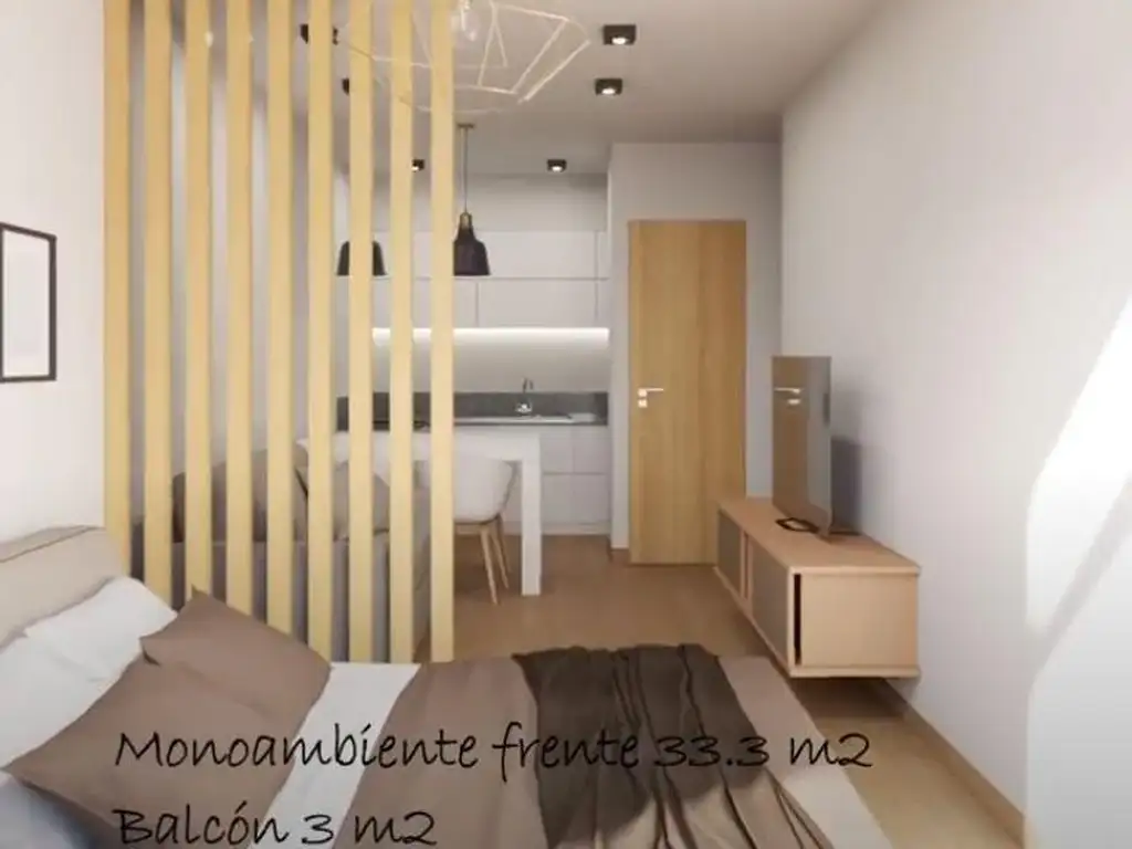 Departamento monoambiente al frente, muy luminoso, con balcón. Pisos de cerámica simil madera. Aberturas de aluminio color negro. Baño con receptáculo de ducha. Cocina con mueble de melamina y mesada color gris mara. Anafe/ horno eléctrico.