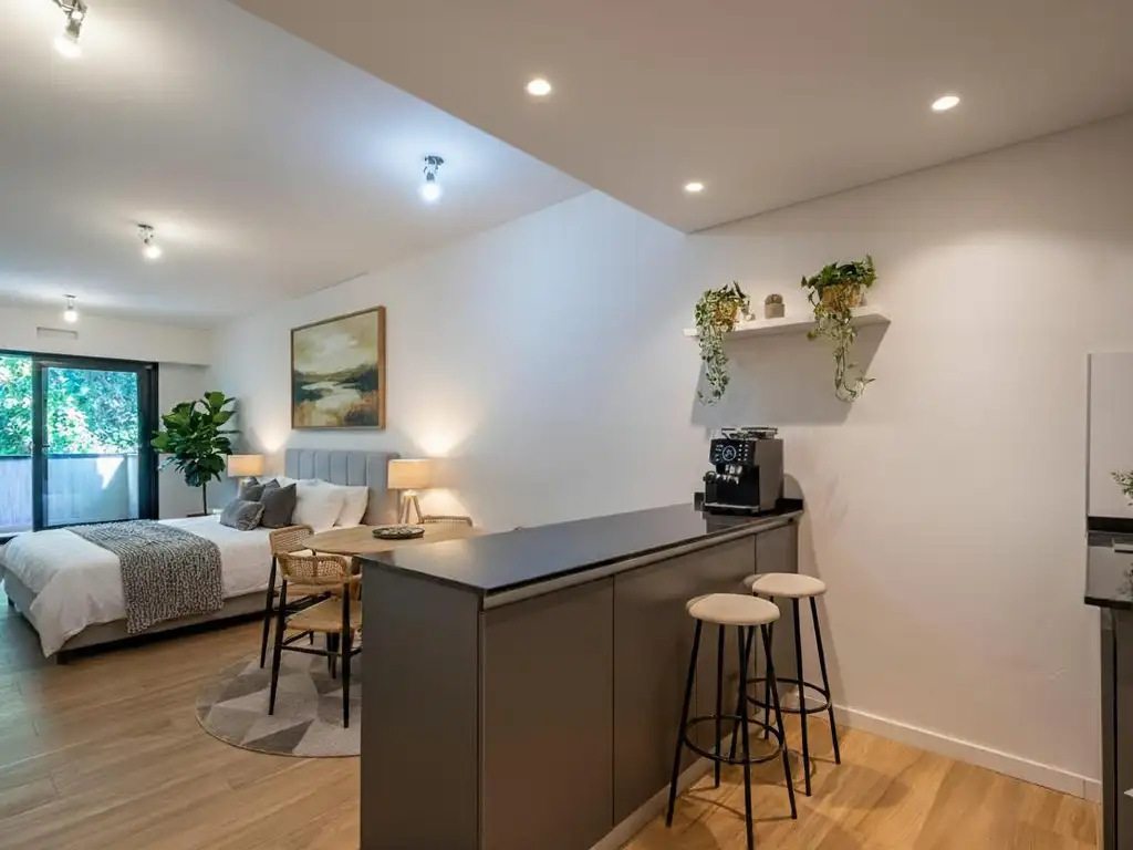 La unidad posee cocina integrada con barra, muebles bajo y sobre mesada. Cuenta con un placard empotrado, baño completo (con bañera) y balcón al frente, con luces.