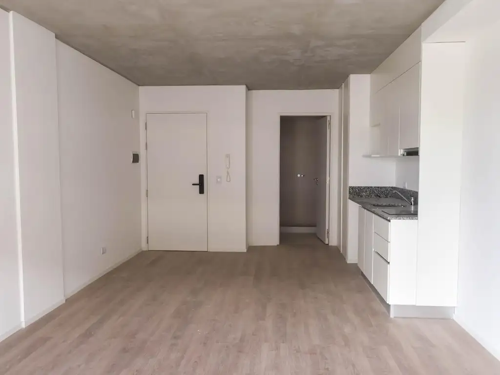 Monoambiente cuenta con un living comedor con salida a balcón (vista lateral), cocina integrada, baño completo y placard.