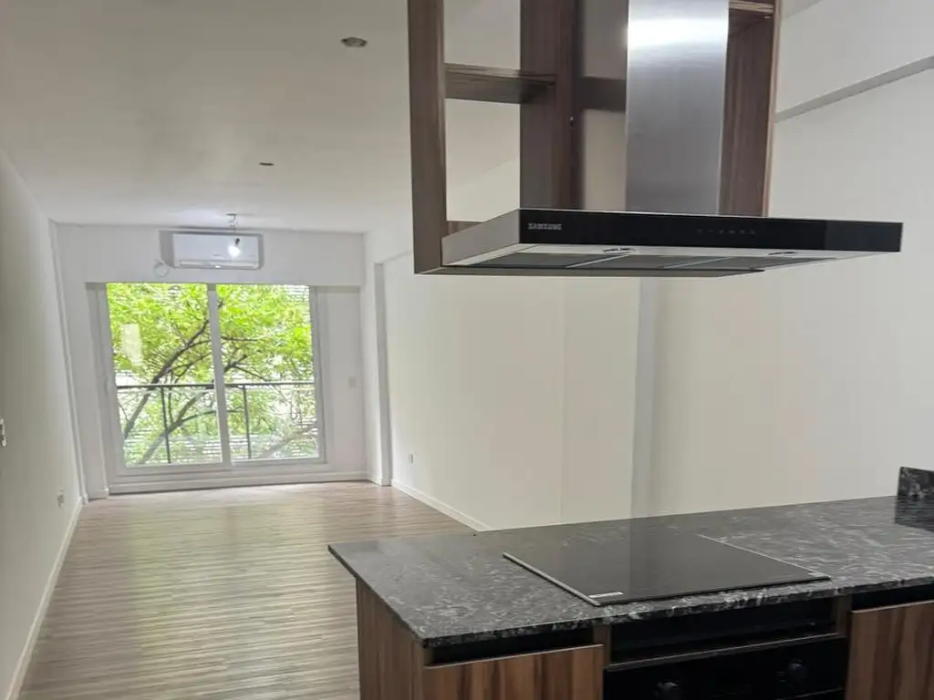 Ingresas al departamento y por la derecha tenes el baño completo , Luego te encentras con el Living con cocina integrada , la misma cuenta con 4 anafes y horno electrico , y posee espacio para conectar Lavarropas.