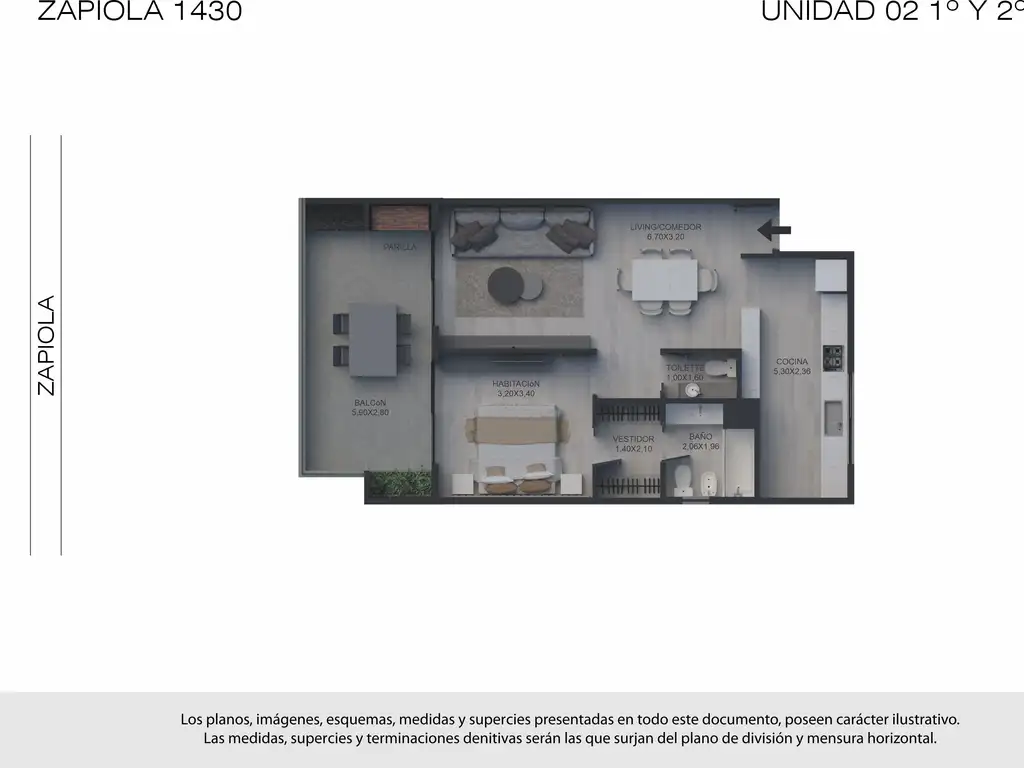 Confortable y luminoso living-comedor con salida a un amplio balcón terraza corrido al frente, equipado con parrilla, ideal para momentos al aire libre. Cocina de generosas dimensiones, equipada con artefacto a gas de cuatro hornallas, pensada para combinar funcionalidad y diseño. Desde el hall de distribución se accede a un elegante toilette de recepción y al área privada del departamento. El dormitorio, orientado al frente, cuenta con baño en suite y vestidor, ofreciendo privacidad y comodidad en un espacio cuidadosamente diseñado.