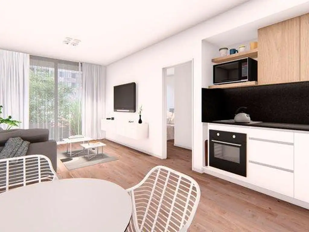 Ni bien ingresamos a la unidad a la izquierda tenemos un toillette de recepción. Luego, la cocina integrada que nos comunica al living comedor que tiene un gran ventanal con salida al balcon que da el frente. La cocina tiene anafe de 4 hornallas y horno eléctrico, mesada de granito y muebles bajo mesada y alacena en Melamina.