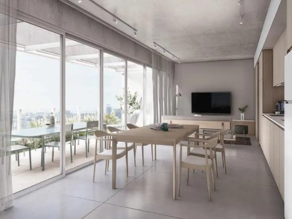 1. Estar/Comedor/Cocina integrada: Un espacio amplio y luminoso que favorece la interacción entre las áreas sociales, con terminaciones de primera calidad y diseño contemporáneo.