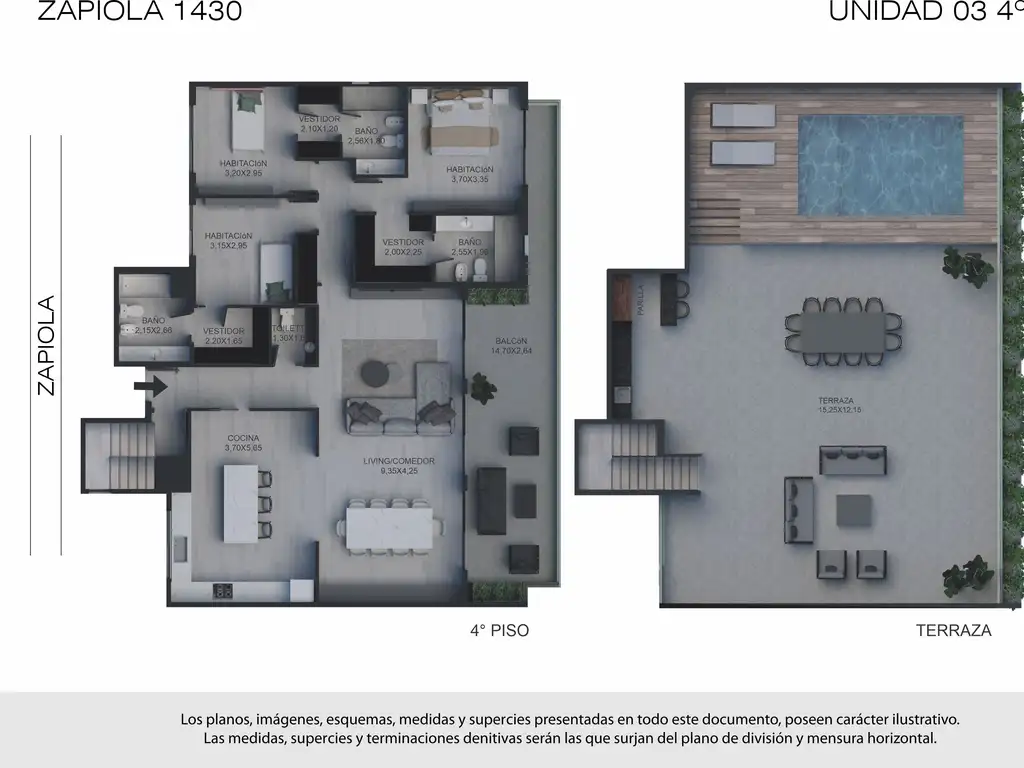 Terraza privada: Impresionante espacio exterior de uso exclusivo, equipado con piscina, solárium, parrilla y áreas de estar y comedor al aire libre. Ideal para quienes buscan confort, privacidad y vida al exterior sin salir de casa.