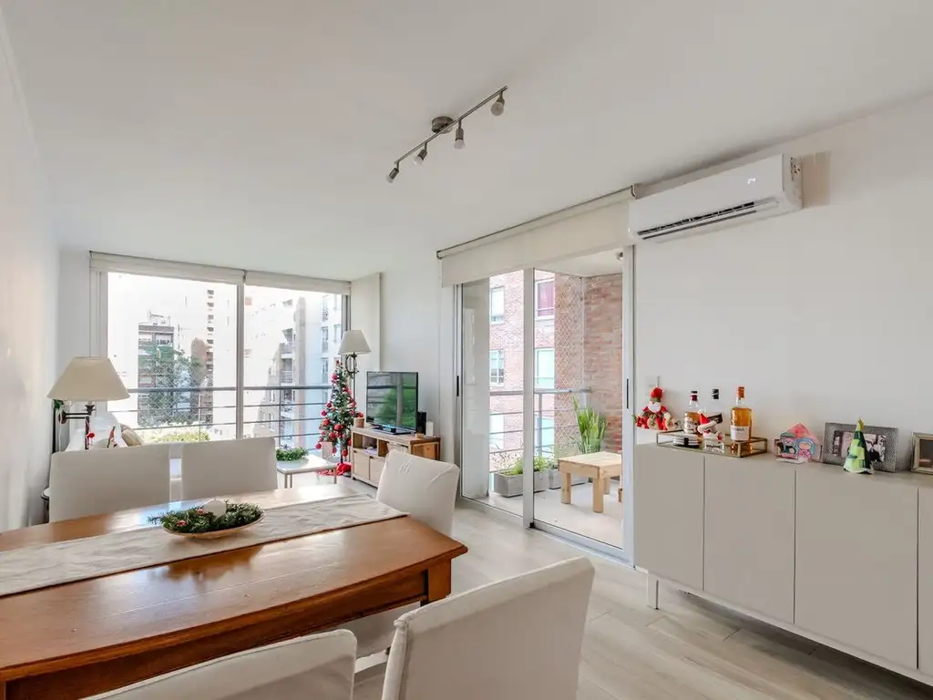 Living comedor de 3.30 x 6 con piso entablonado a ventanal que da hacia el balcón.
