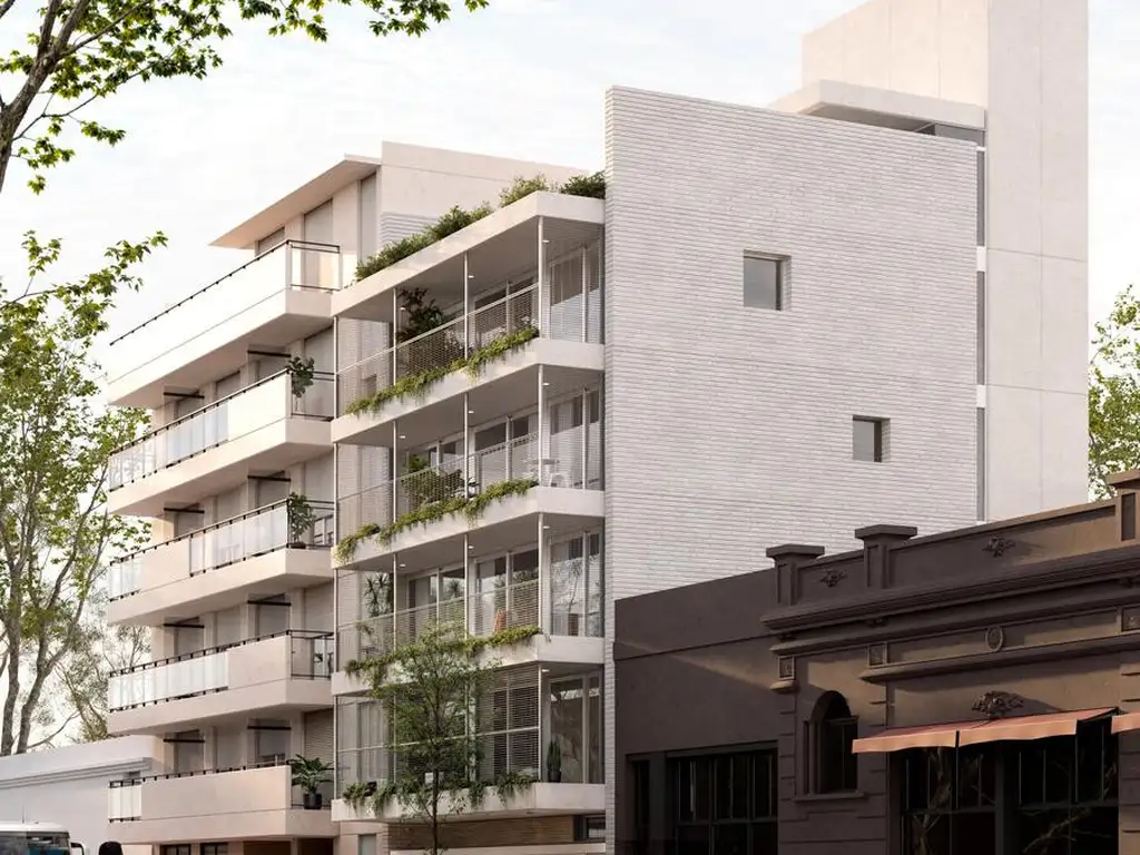 Cada unidad dispone de un amplio balcón terraza, diseñado como un espacio de expansión semicubierto, ideal para disfrutar del aire libre con comodidad. El ingreso peatonal en planta baja es luminoso y se desarrolla a través de un espacio semicubierto, donde se encuentra un patio con vegetación, que aporta frescura y bienestar. En este sector también se ubican las dos cocheras, asignadas a los departamentos de dos dormitorios, y un bicicletero con capacidad para las seis unidades. Además, en la planta baja se encuentra un local comercial, que cuenta con baño y cocina propia, así como una amplia vidriera sobre la calle San Luis, brindando excelente visibilidad y exposición.