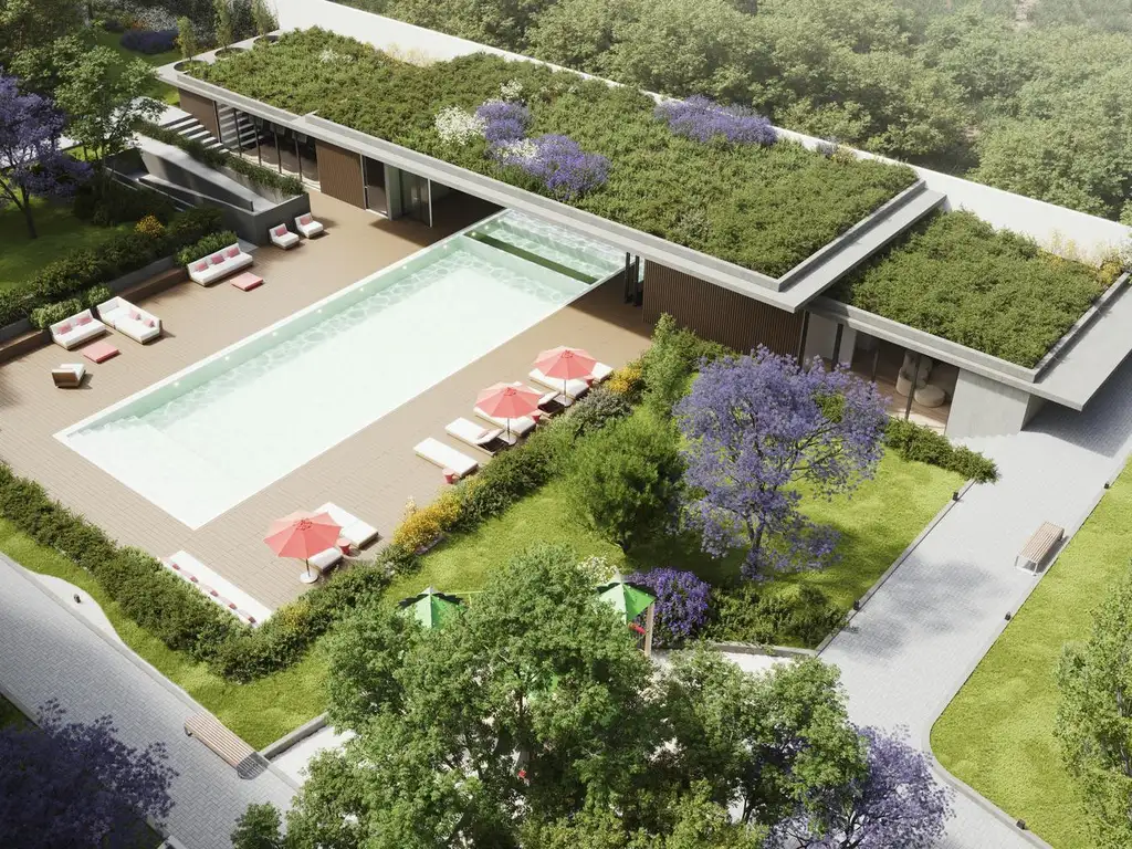 Proyecto: El conjunto se compone de tres volúmenes. El primero está compuesto por planta baja y cinco pisos, destinado a diferentes usos. Sobre Av. Eva Perón, se encuentran las oficinas y, en planta baja, los locales comerciales. Hacia el interior de la manzana, se encuentran las unidades residenciales. El segundo está compuesto por un local comercial de gran dimensión en planta baja y cuatro pisos. El tercero también cuenta con un local comercial en planta baja de similiares dimensiones y tres pisos. Las unidades residenciales, con vista a los grandes y forestales espacios comunes, se distribuyen en tipologías de 1, 2 y 3 dormitorios. El paseo de locales comerciales creará un gran polo gastronómico. El proyecto cuenta con amenidades de primer nivel: Vestuarios, sum, pileta climatizada, gimnasio, sauna, áreas verdes, parque infantil, fogoneros y demás.
