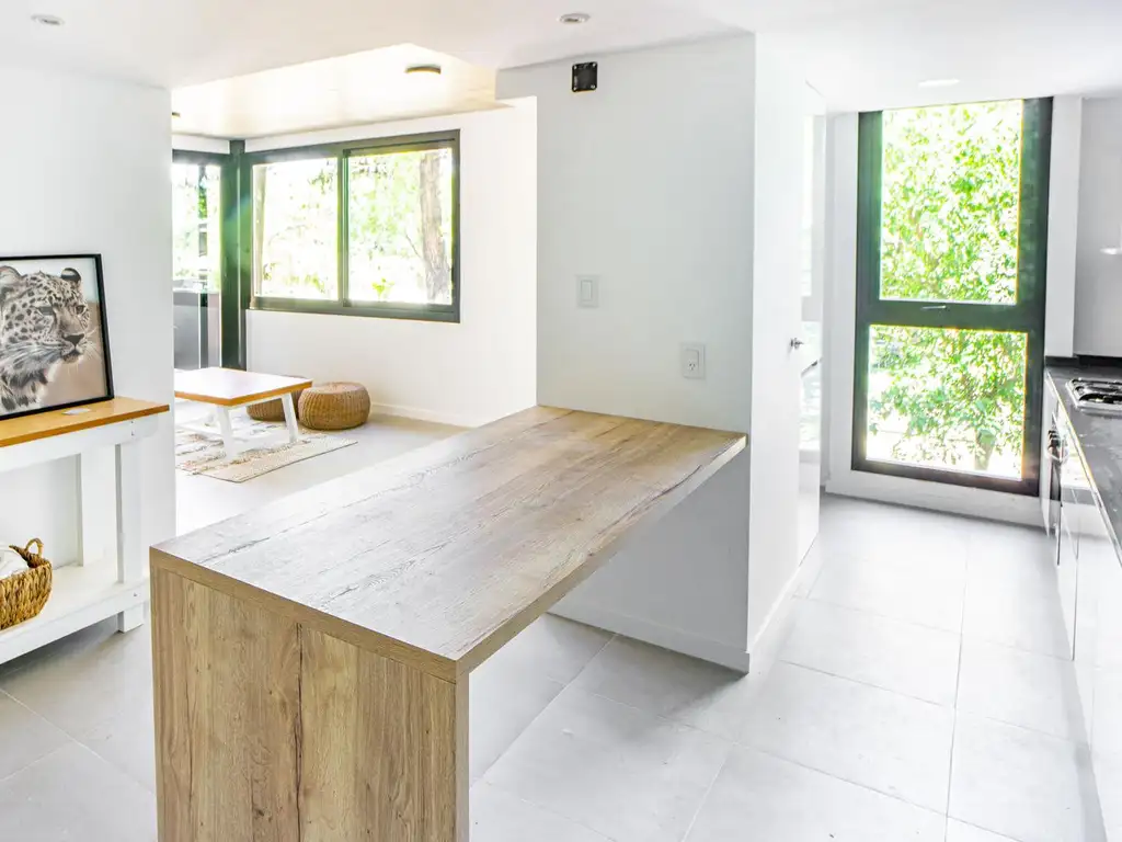 Departamento de 2 Dormitorios en Planta Baja con Patio y vista a la arboleda perimetral. Unidad con cocina semi integrada con amoblamiento completo, bajo mesada, alacena y barra. Living comedor con ventanal a medida y salida al patio exclusivo con parrillero privado. Un baño completo, un toilette y 2 dormitorios con placares, ambos con salida al patio.