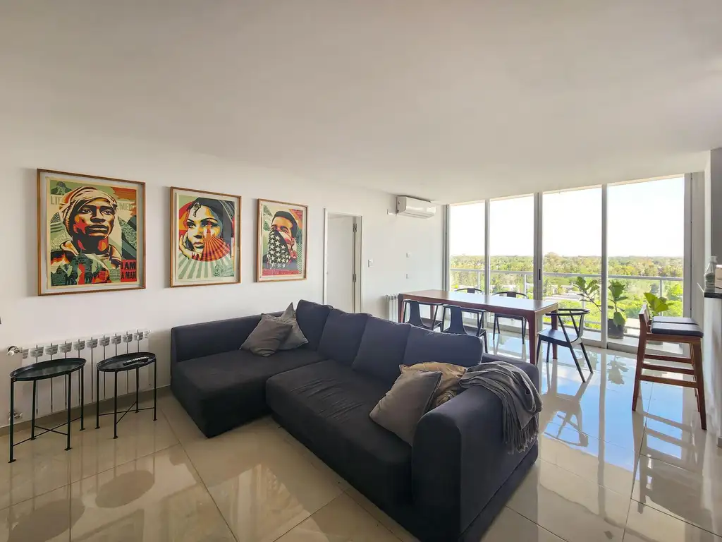 La unidad se encuentra en el piso 8 con vista totalmente despejada a hermoso espacio verde. Ingreso principal al living-comedor con cocina semi separada, salida inmediata a balcón aterrazado con sector de lavadero y posibilidad de parrillero. Distribuidor a sector intimo con 3 dormitorios (el principal con vestidor, baño en suite y salida a balcón secundario con vista despejada al lago) y 1 baño secundario completo con bañera. Terminación de excelente calidad, con pisos de porcelanato en combinación con madera de ingeniería en espacios íntimos, aberturas de aluminio con DVH de alta prestación, cocina con mobiliario completo de alacena, bajo mesada, bacha de acero inoxidable doble, anafe y horno diferenciado eléctrico, mesada de granito negra y banquina en aluminio, espacio técnico para heladera, microondas y lavavajilla. Baños con loza sanitaria, griferías de primeras marcas y toalleros colocados. Todos los dormitorios cuentan con placares con puertas corredizas de piso a techo con interiores diseñados. Agua caliente por caldera y climatización por radiadores más preinstalación de aire acondicionado en todos los ambientes.
