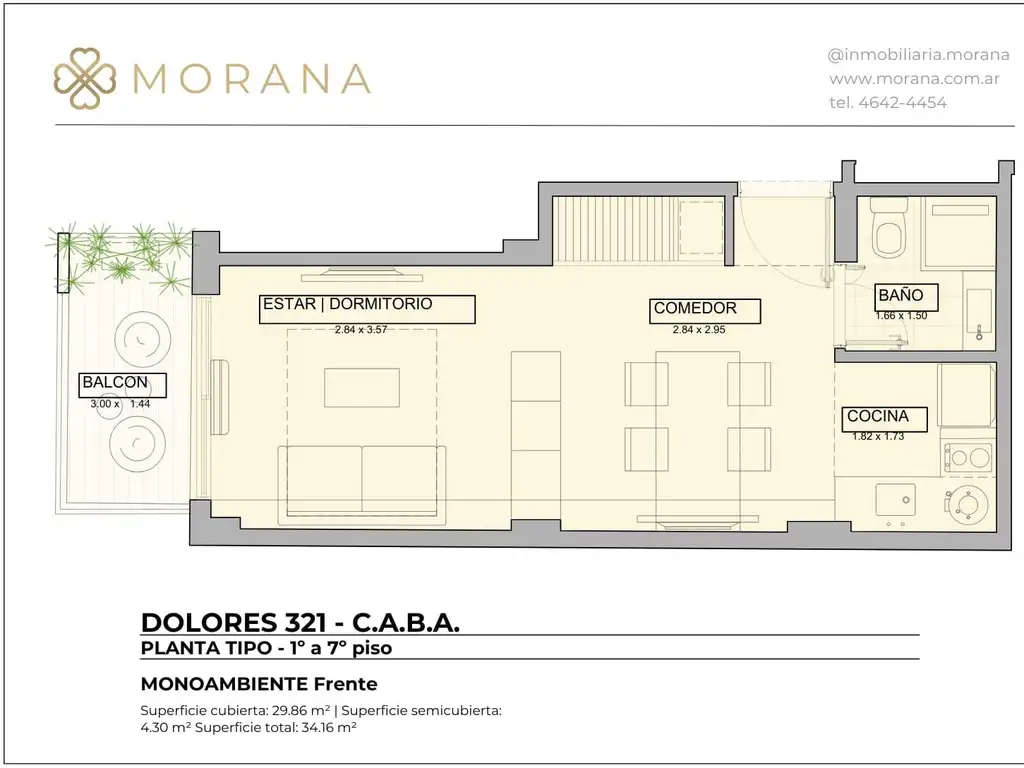 La unidad: departamento monoambiente con balcón al frente. Su extensión a lo largo facilita la subdivisión de los espacios y su ventanal con salida al balcón aporta luminosidad y buena ventilación. Es una unidad ideal si se busca un espacio funcional y moderno.
