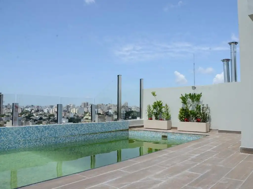 Balcón con parrilla, pileta, mesa para 6 personas y sombrillas.