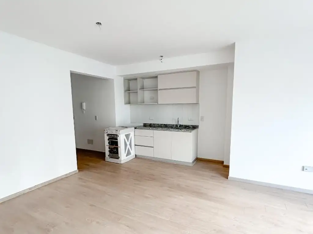 Living con pisos de madera flotante, con cocina incorporada con piso de porcelanato y salida a balcón corrido. Dormitorio con piso de madera flotante.