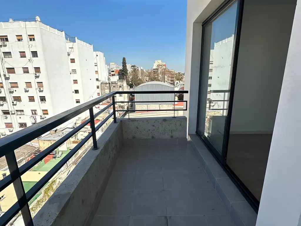 Departamento de 2 ambientes con cocina integrada que cuenta con mueble alacena y bajo mesada. Tiene horno y anafe de 4 hornallas electrico. El living comedor tiene un ventanal que da a balcon al contrafrente.