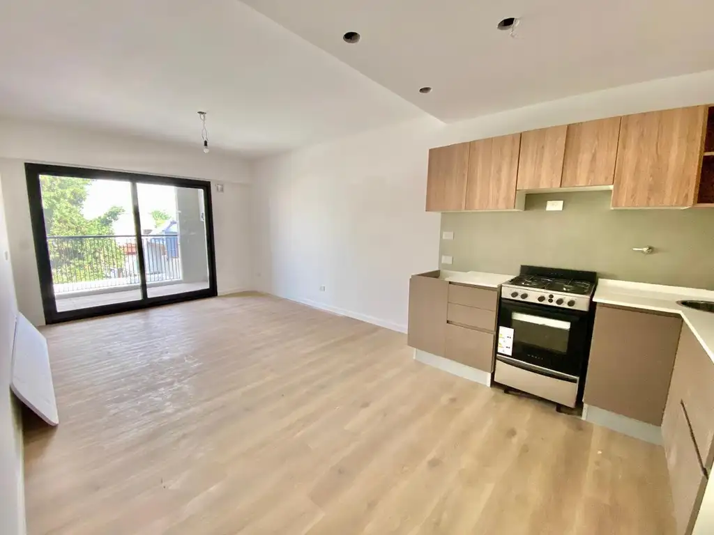 Se ingresa al living comedor, un espacio cálido, luminoso y confortable. La cocina se encuentra integrada al espacio y se ubica en esquina. Muebles de cocina bajo mesada y alacena de melanina combinando dos colores, beige y un marrón más oscuro. Artefacto de cocina a gas marca Orbis.
