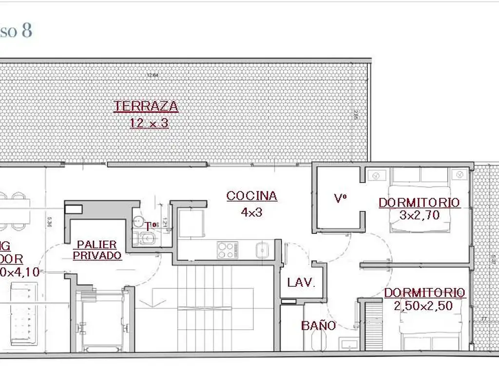 Balcón terraza de 12 mts x 3 mts con posibilidad de realizar un cerramiento e instalación de una parrilla.