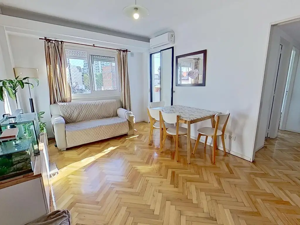 Amplio Living- comedor de 15m2 ( 5m x 3m) con pisos de parquet en perfecto estado, ventana al contrafrente con vista abierta y salida a balcón lateral.