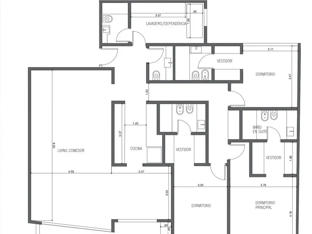 Living amplio con comedor, salida a balcón. Cocina, Toilette y Lavadero con el baño de servicio. 3 dormitorios en suite con vestidor. Dos dormitorios con salida a balcón sobre Av. Avellaneda.