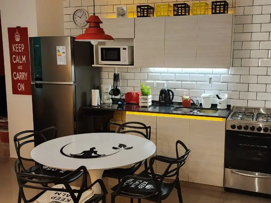La unidad se encuentra en el 6 piso al contrafrente de un moderno edificio, cuenta con una cómoda cocina con muebles bajo mesada y alacenas, conexión para lavarropas y artefacto de cocina con horno y 4 hornallas a gas, Heladera, Aire acondicionado frio calor Electra 3500 frigorías, Vajilla completa para 4 personas Ollas Hudson, cafetera eléctrica, pava eléctrica, horno microondas, tostadora eléctrica, cubiertos tramontina, sabanas, acolchados, almohadas inteligentes, porta cubre colchón, la cama matrimonial, escritorio con lampara, Placard con cajonera, Mesa de luz con su respectiva lampara de diseño, Sillones con butacas apoya pies, Mesa de recepción. Baño completo con espejo smart con radio Bluethooth luz y desempañador. con bañera y ventilación natural, y comodo balcon.