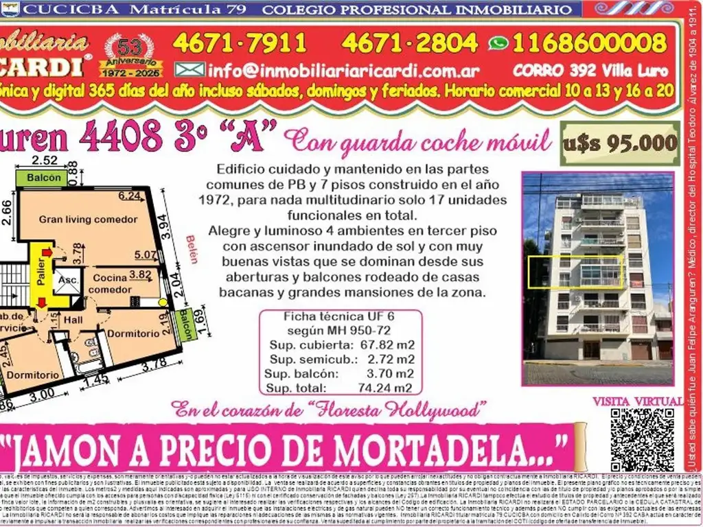 La Inmobiliaria RICARDI NO garantiza que el inmueble cumpla con el certificado de conservación de fachadas y balcones (Ley 257) tampoco efectúa el estudio de títulos, ni analiza los alcances del Código de edificación y no será responsable por los vicios ocultos o redhibitorios que competen a quien corresponda. Advertimos al adquirente que las instalaciones eléctricas, de gas natural y-o sanitarias pueden NO solo no tener un correcto y adecuado funcionamiento técnico sino que además puede NO cumplir con las exigencias actuales de METROGAS- EDESUR- EDENOR - siendo a cargo del adquirente que implique su puesta en valor y-o funcionamiento.