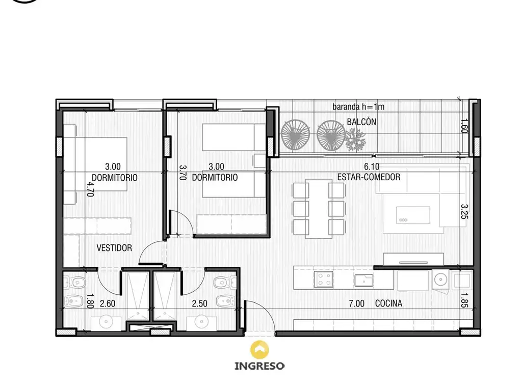 Amplio estar comedor con cocina integrada e isla. Salida a balcón al Oeste con vista al parque. Suite principal con vestidor y ventanal al contra frente. Habitación secundaria asistida por baño completo. Espacio para lavadero en la cocina. Seguridad 24hs.