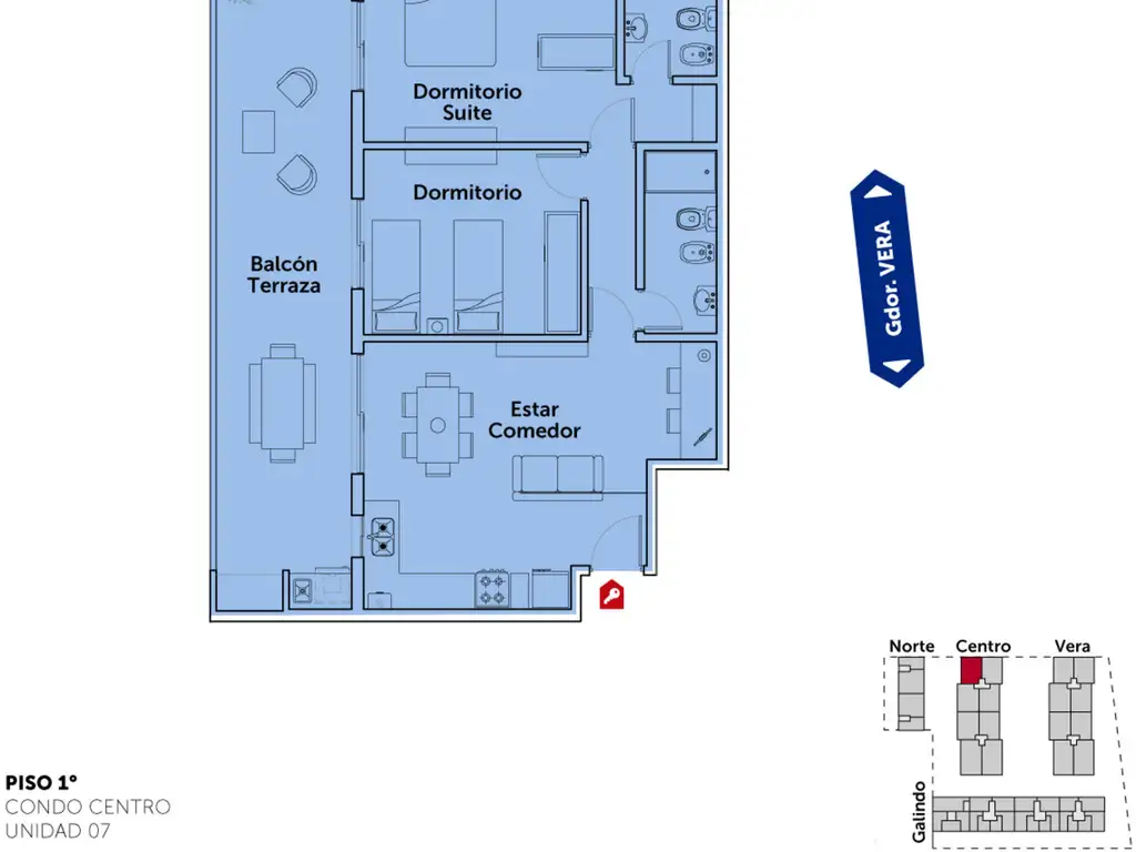 Departamento con gran balcón de 28 m2 + parrillero. Ingreso por el estar/comedor, la cocina completamente equipada, área de dormitorios totalmente separada, la habitación suite cuenta con vestidor y baño privado, ambos dormitorios con salida al inmenso balcón terraza (con vista a los jardines del complejo). La unidad cuenta con dos baños completos.