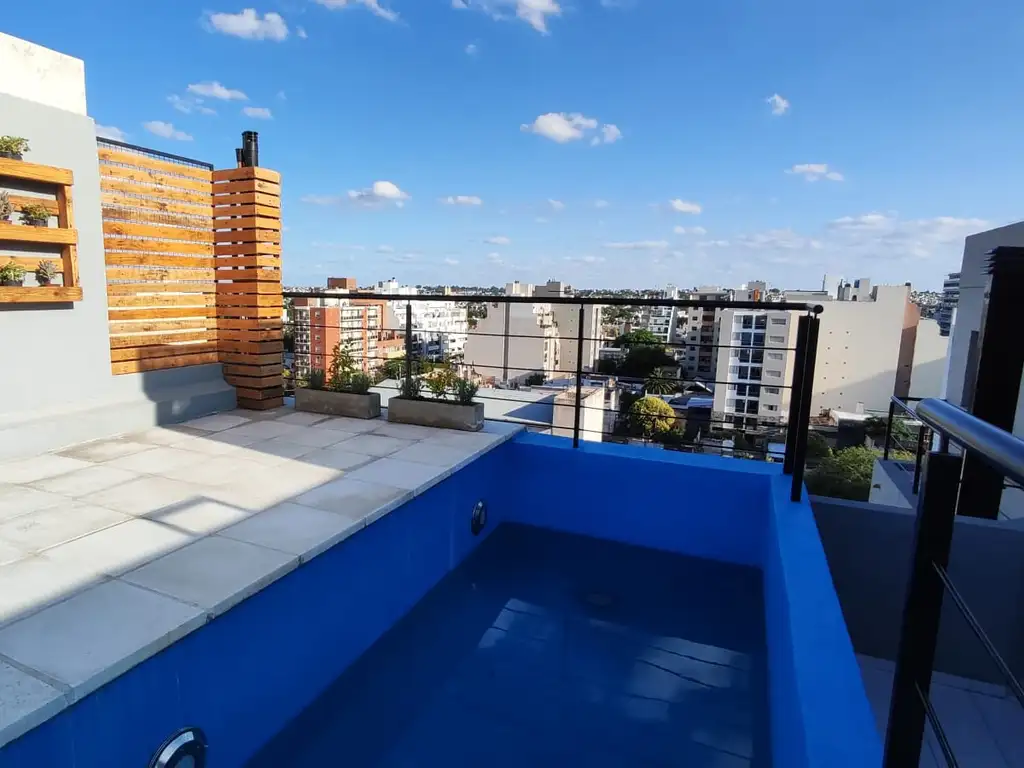 Exclusiva terraza con pileta y asador, perfecta para relajarte, compartir con amigos o disfrutar de los atardeceres en la ciudad.