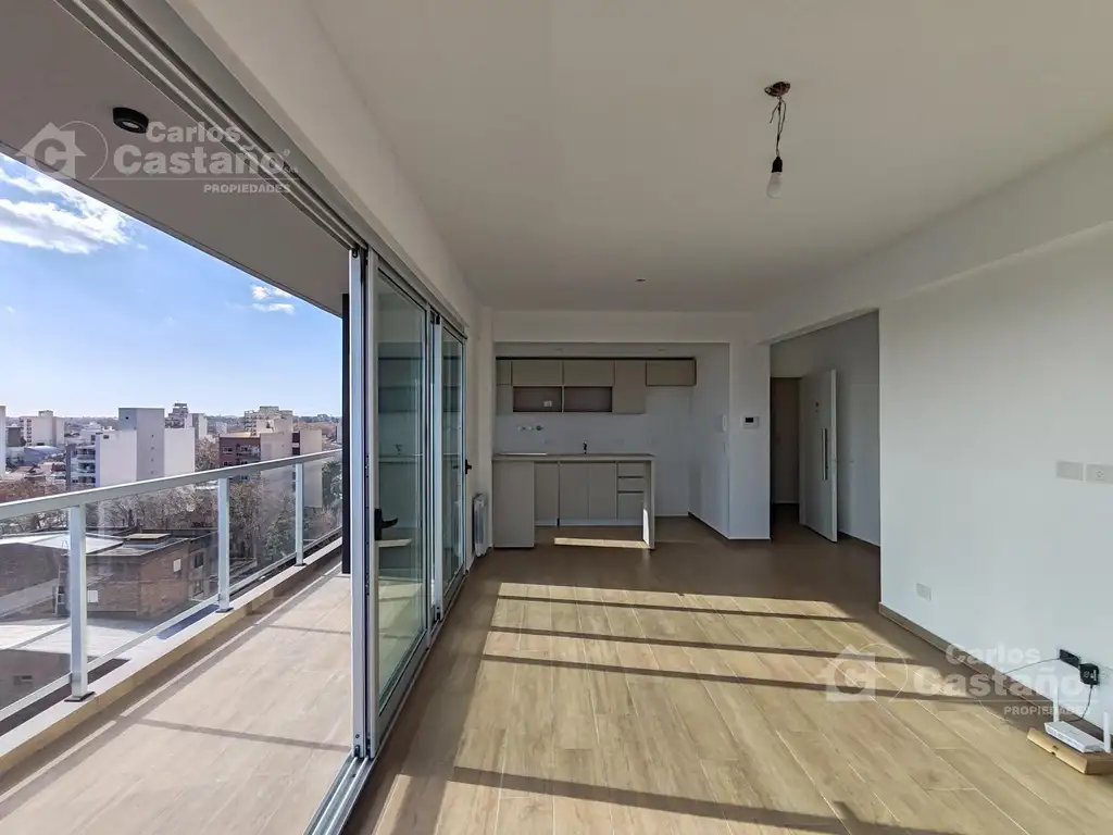 Hall; Living-Comedor de 7,1x3,35m pisos Porcelanato, ventanales grandes "A30", doble vidrio (DVH) con salida al Balcón (tiene parrilla eléctrica); Cocina integrada al Estar de 3,82m de largo, muebles completos de alacenas y bajo mesada, anafe, horno empotrado, lugar heladera grande; Baño completo; 2 Dormitorios: 1o de 4,4x3m (en Suite con Vestidor) y 2o de 3,3x2,7m con salida de este cuarto al Balcón.