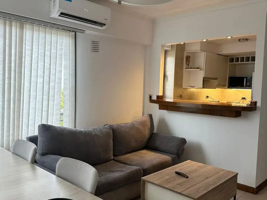 La unidad se distribuye en 3 ambientes, incluyendo 1 dormitorio y 1 baño completo. Posee un amplio living-comedor con ventanales y un balcón con vista hacia el oeste. La cocina está equipada con amoblamiento de alacena y bajo mesada, y cuenta con una barra que la separa del comedor.