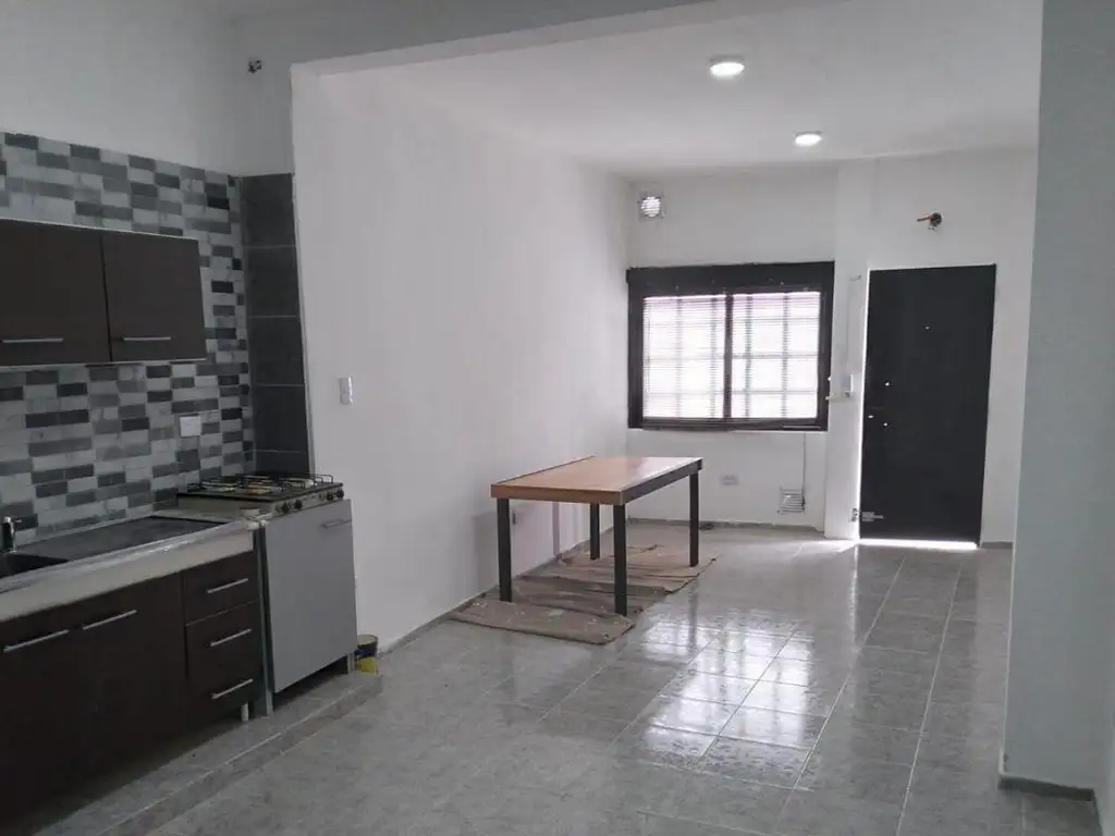 Departamento al frente con espacio guardacoches en la vereda consta de un ambiente principal integrado a la cocina, dormitorio a dividir y un baño completo.