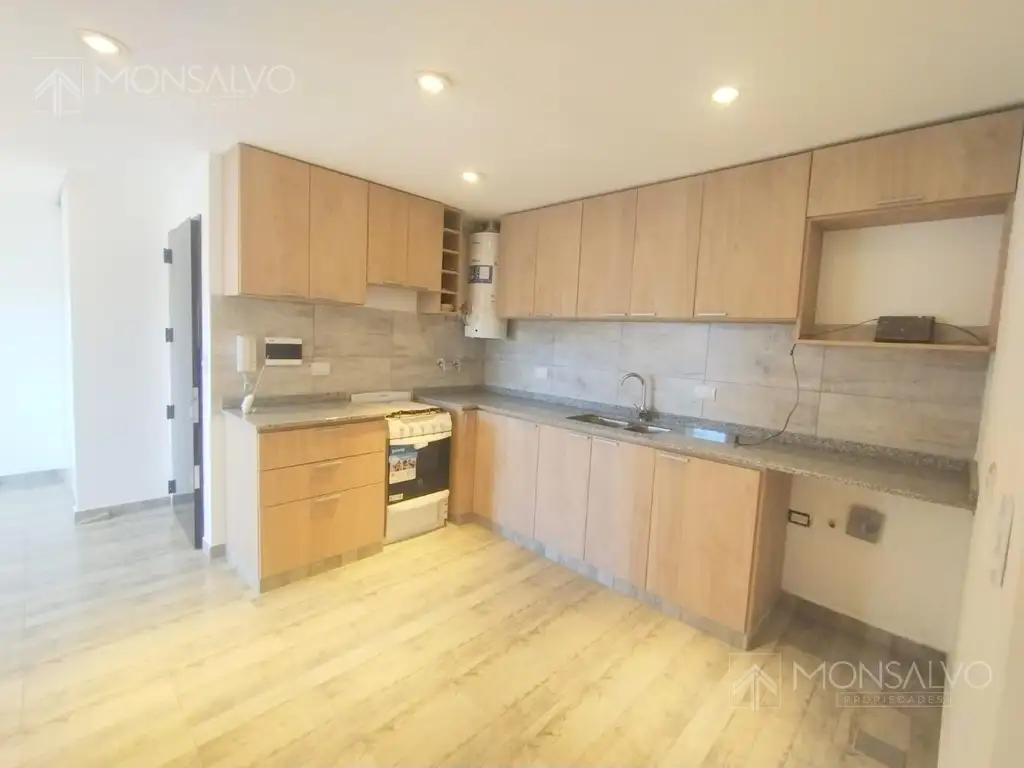 Conecta con una cocina semi integrada, muy comoda y completa. Con muebles altos y bajos.