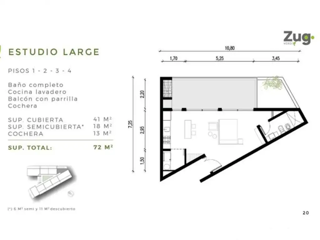 Desarrollado en una sola planta con 59m2 totales construidos (cubiertos: 41m2 / semi cubiertos: 18m2) y descubiertos: 13m2.