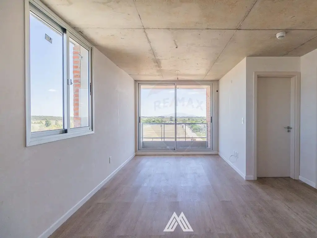 Cocina integrada con living comedor y acceso al balcón con ventanal de techo a piso.
