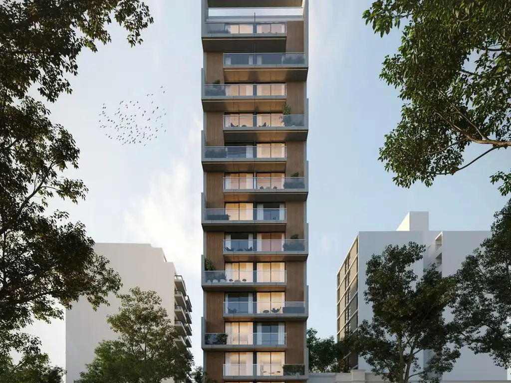 El emprendimiento cuenta con 12 plantas compuestas por amplias unidades funcionales de dos ambientes y una terraza de uso común con piscina, parrillas y salón de usos múltiples, mientras que en planta baja dispone de un local comercial al frente y una oficina al contrafrente.