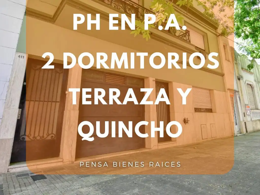 PH en primer piso por escalera con 118mts. cubiertos y 162mts. totales aprox. consta de living-comedor, amplia cocina separada con muebles sobre y bajo mesada, dos dormitorios y posible tercer dormitorio, baño completo y balcón al frente. En el segundo piso por escalera, encontramos un quincho con parrilla y terraza con toilette más un espacio separado que puede ser utilizado como por ejemplo escritorio o taller.
