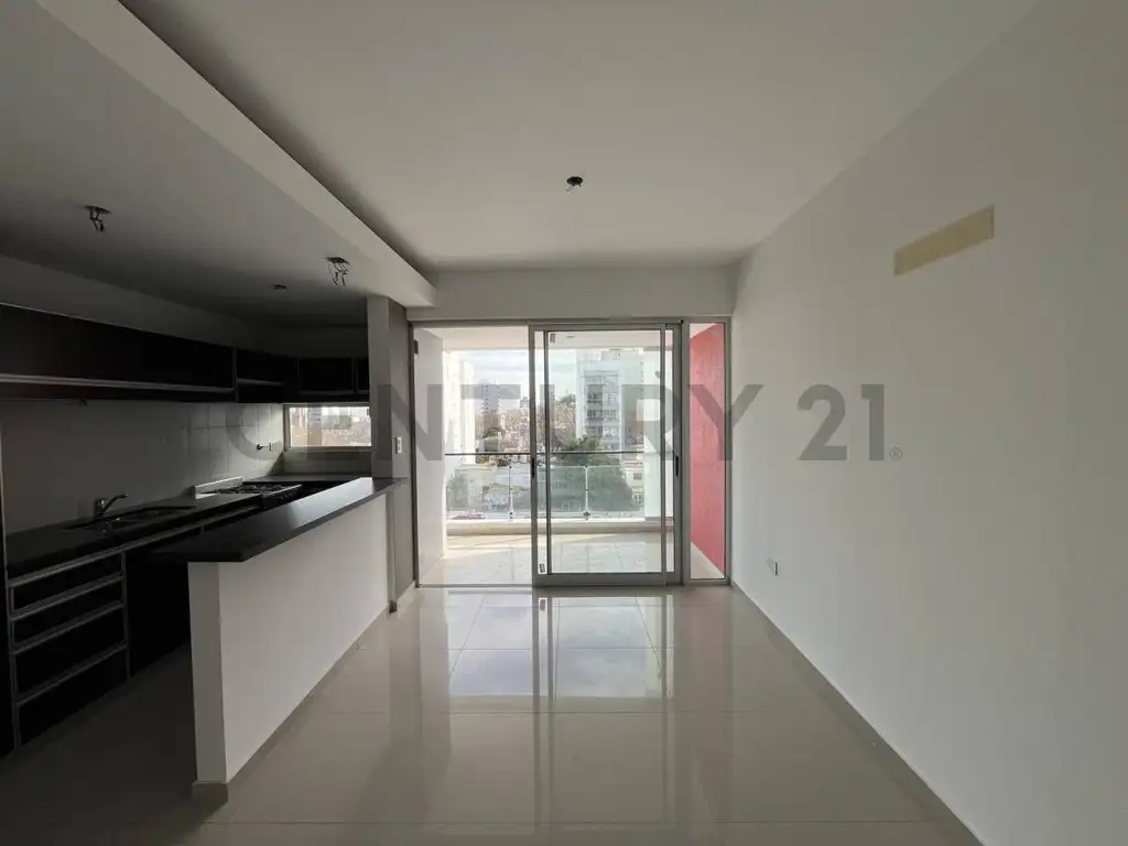 Al ingresar, nos encontramos con un ambiente dividido por durlock que puede ser utilizado como un segundo dormitorio o escritorio, con ventilación natural. Además, cuenta con toilette, baño completo y dormitorio principal con placard (sin interior, sólo con puertas). Living comedor con cocina semi-integrada, equipada con barra desayunadora, muebles bajo y sobre mesada, y conexión para lavarropas. Desde el living comedor, se accede a un amplio balcón pasante con vista despejada y sol durante el mediodía y la tarde.