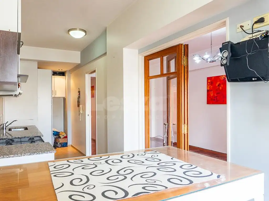 2 dormitorios con placards, el principal con salida a balcón al contrafrente, escritorio, living-comedor con balcón al frente, espaciosa cocina comedor diario con sector de lavadero, baño completo con hidromasaje. Cuenta con calefacción central por radiadores con caldera individual, pisos de madera en todos los ambientes y puerta blindada. Incluye cochera cubierta.