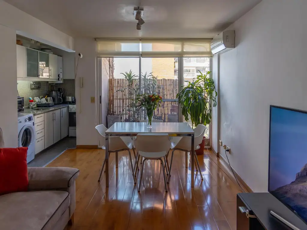 - *Planta Baja:* Amplio y luminoso living-comedor con cocina integrada, equipada con conexión para lavarropas. Salida directa a un encantador *balcón abierto al contrafrente*, con vistas a un hermoso pulmón de manzana rodeado de arbolado, perfecto para disfrutar de momentos de relax.