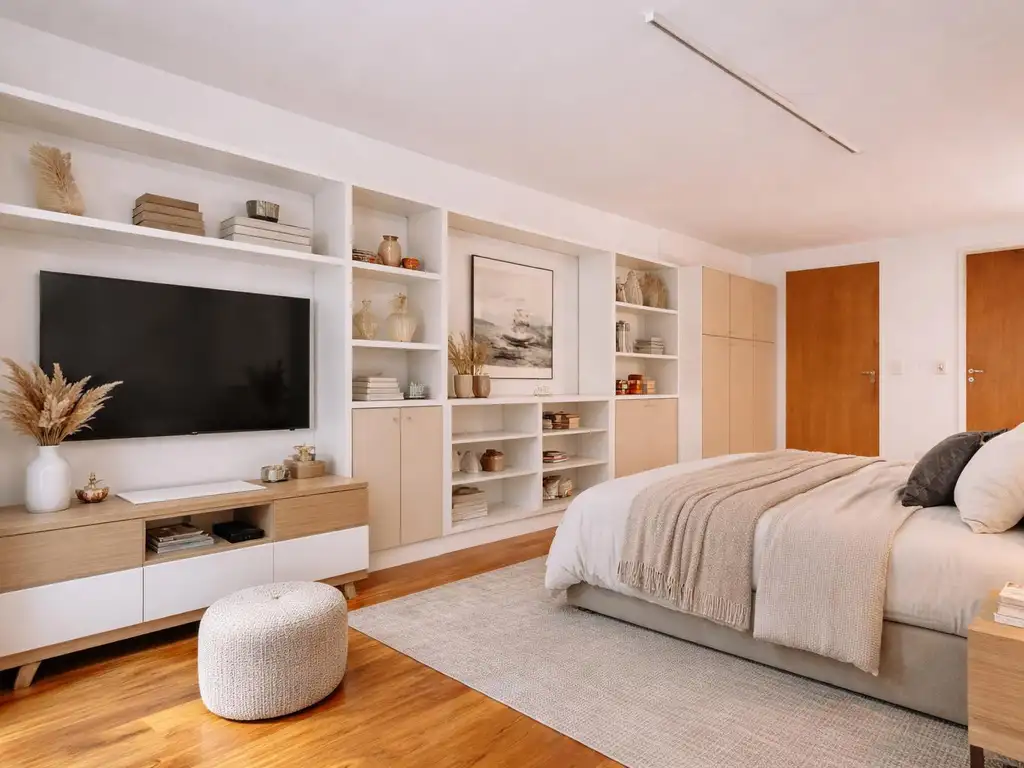 Cómodo dormitorio en suite con vestidor walk-in de carpintería de categoría. Se destaca un mueble modular a lo largo de todo el dormitorio, con estantes, cajones y múltiples espacios de guardado, sumamente versátil y funcional.