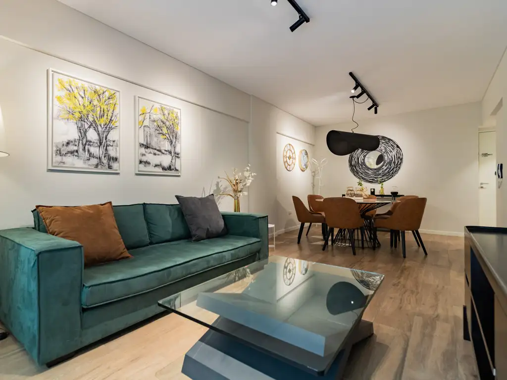 El departamento cuenta con terminaciones de máxima calidad: Doble vidriado hermético en sus carpinterías exteriores de aluminio Módena 2 de Aluar, pisos de porcelanato simil madera marca ILVA modelo Legni, porcelanatos en baño y cocina, griferías FV, muebles de cocina bajo y sobre mesada en PVC termoformado marca Reno modelo Neutra, mesadas de granito negro. Frentes e interiores de placards marca Reno. Calefacción por piso radiante y agua caliente por caldera individual a gas marca Peisa.