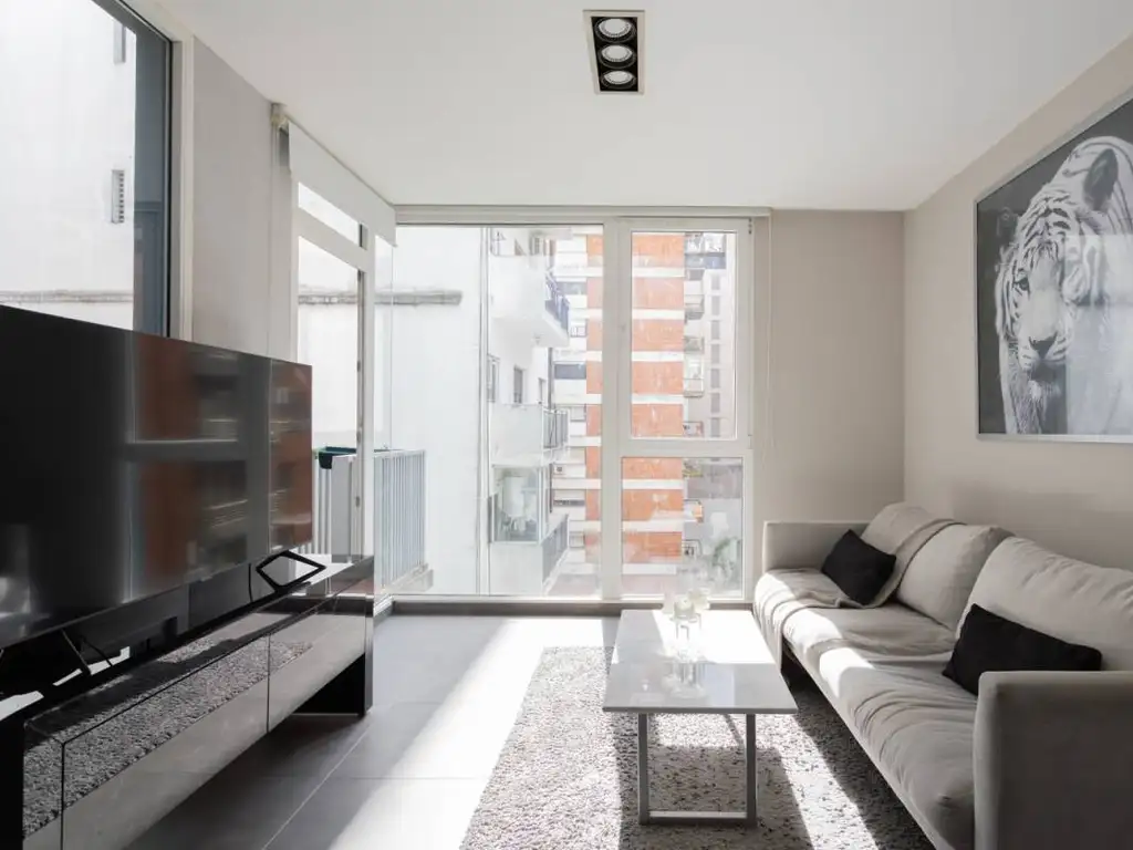 Edificio moderno con amenities (pileta, solárium, parrilla, hidro, sauna) y tótem de seguridad en ingreso.