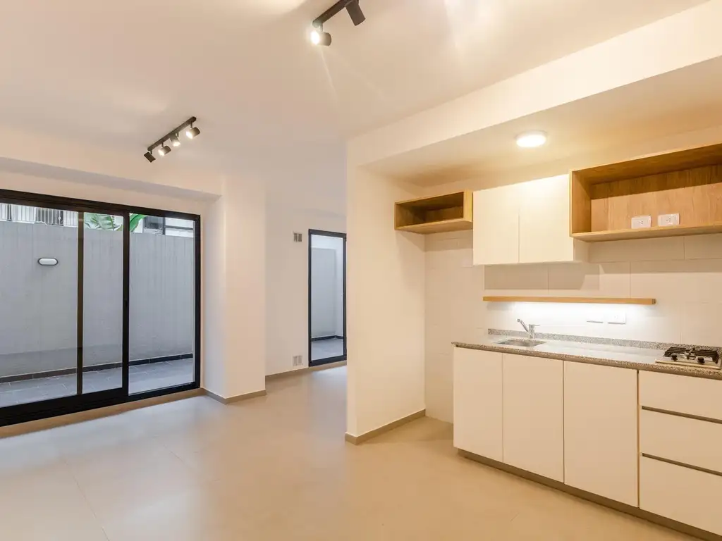 El departamento, con forma de letra L, puede dividirse quedando la habitación de forma independiente con su vestidor y baño completo. Tanto el living como la habitación dan a un gran patio mediante 2 ventanales.